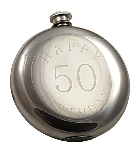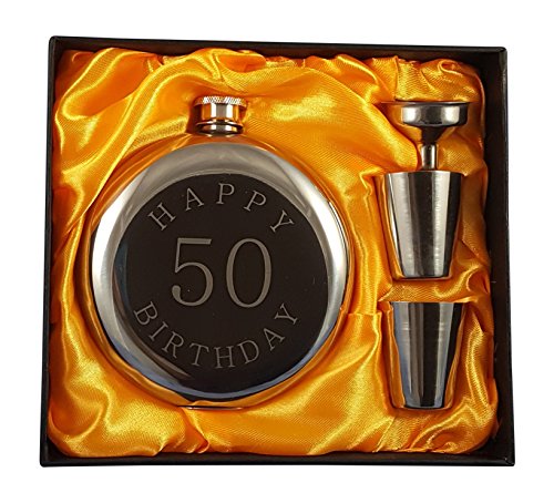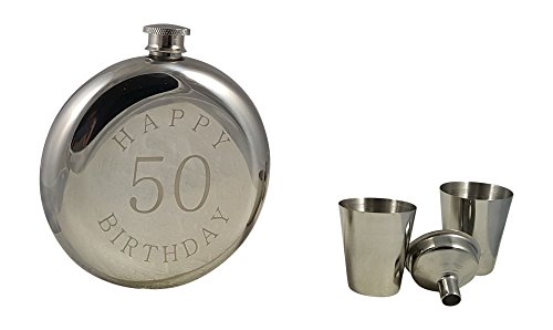 What's Included This set includes a round flask made of stainless steel with a special "Happy 50 Birthday" message engraved on the front, two shot glasses, and a convenient funnel. All of this is delivered in an elegantly packaged gift box. Keep 10 oz of your favorite drink with you in an impressive flask, which fits nicely in your pocket. Whether at a sporting event, a movie, a bachelor/bachelorette party, or a wedding, this flask will help you conceal your favorite drink. Discretely hide your flask in your pocket next to your hip or in a backpack, briefcase, or purse. Bring a drink at your next tailgate party or while out fishing. This set contains two shot glasses so you can enjoy a drink with a friend.