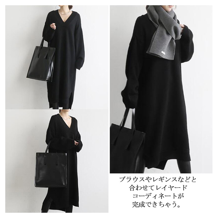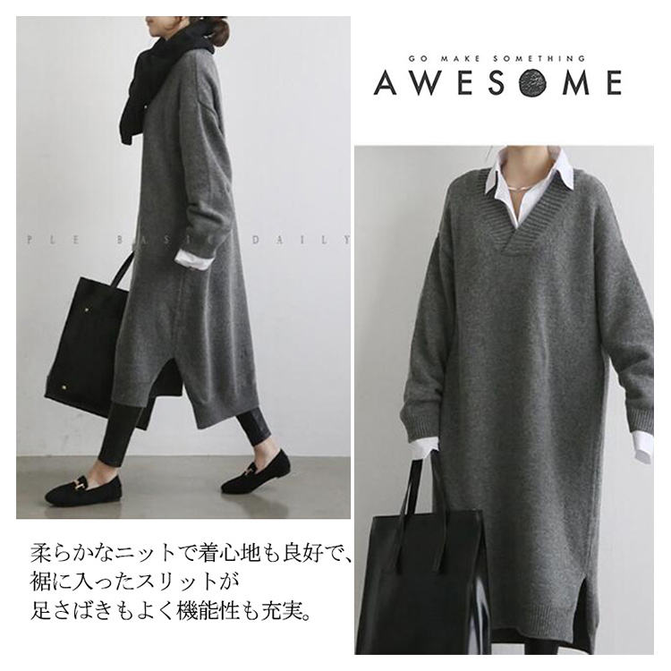 | ゆるっとしたシルエットでもスタイルアップポイントを押さえた大人ニットワンピ。Vネックがデコルテラインを綺麗見せしてくれるのもポイントです。柔らかなニットで着心地も良好で、裾に入ったスリットが足さばきもよく機能性も充実。たっぷりと余裕のあるシルエットで体型カバー効果抜群でマタニティ用にもOK。ブラウスやレギンスなどと合わせてレイヤードコーディネートが完成できちゃう。 | |