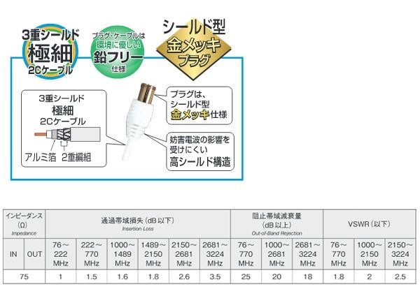 出力ケーブル付、地デジ/BS・CS分波器(セパレーター)です。極細ケーブルでスッキリ設置可能です。4K8K放送に対応!!