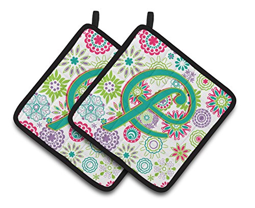 Caroline's Treasures Letter F Flowers Pink Teal green Initial Pair of Pot Holders CJ2011-FPTHD, 7.5HX7.5W, Multicolor