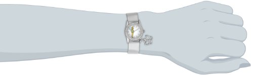 Polish finish silver-tone round case with sparkling rhinestone bezel, butterfly charm on case. It also features shiny white dial, a mix of silver Arabic numeral and sticks, full color Tinkerbell image printed. Silver metallic strap with buckle closure is powered by precise Japanese quartz movement.Feature