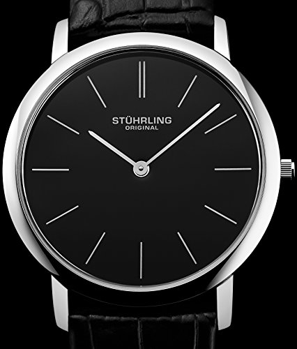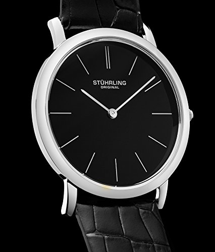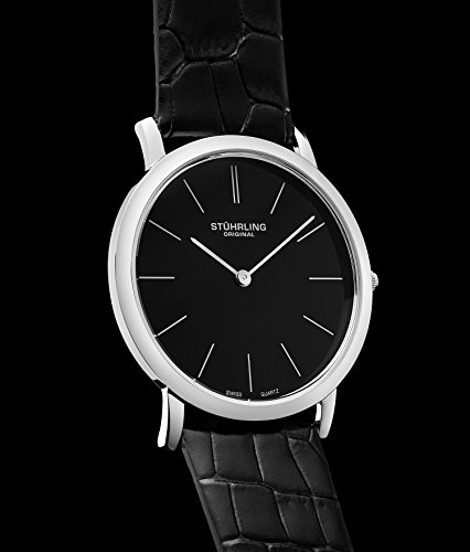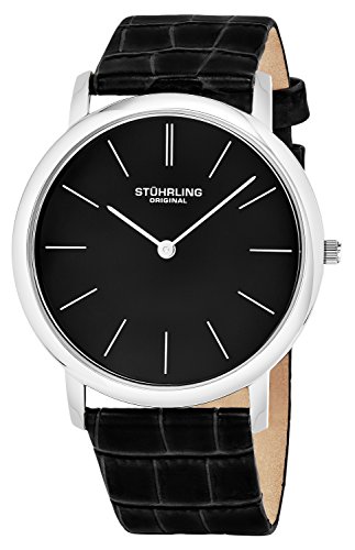 Round dress watch with black alligator-embossed band featuring black dial with slim baton-style hour markers and hands