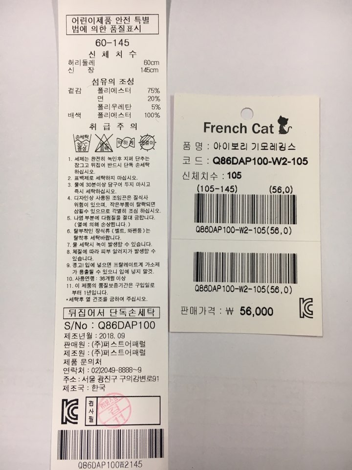 제품소재 : 겉감: 면58% 폴리에스터38%폴리우레탄4%