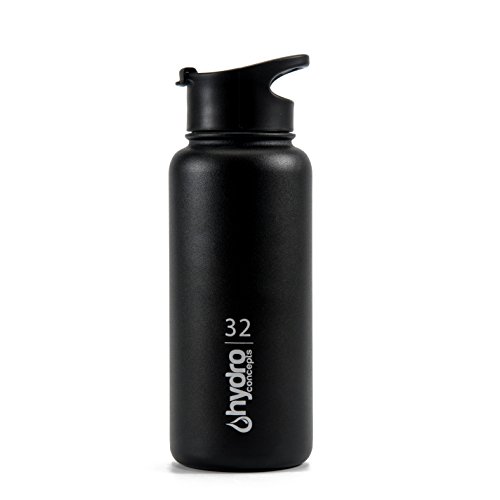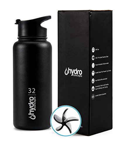 Shaker Bottle by Hydro Concepts | Insulated Stainless Steel, BPA Free, Wide Mouth Double Walled Vacuum, Large, Cool, Hard, Leak Proof Handle Lid, Mixer Ball, Sweat-Free Power Coated | 32 oz | Black