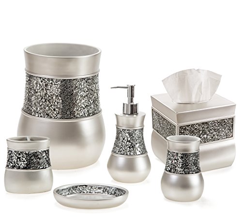 FASHION-FORWARD BATH ACCESSORY; the Silver Mosaic Glass Collection sports a brushed pewter finish topped off with crackled glass for a contemporary feel. This bath accessory set is sure to elevate the look of any bathroom decor and also add functionality! Plus, this is a fail-proof gift idea for spa lovers!