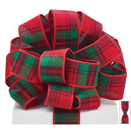 Product Description#9 reversible green, red, and black plaid ribbon. One side is woven and other is flannel. Has red sewn wired edge.0
