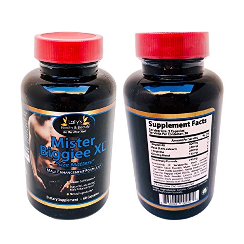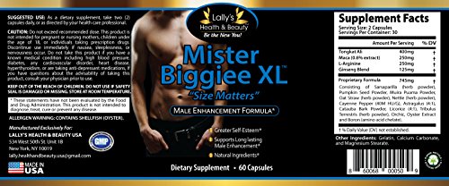 Studio : LALLY'S HEALTH AND BEAUTY USA LLC Publisher : LALLY'S HEALTH AND BEAUTY USA LLC Binding : Health and Beauty Product Description MR. BIGGIEE XL, is a potent male enhancement formula fortified with powerful ingredients designed to promote sexual health including Tongkat Ali, Maca, L-Arginine, Ginseng Blend, Proprietary Blend: Saraparilla, Pumpkin Seed Powder, Muira Puama Powder, Oat Straw, Nettle, Cayenne Pepper, Astragalus, Catuaba Bark Powder, Licorice, Tribulus Terrestris, Orchis, Oyster Extract, and Boron. MR. BIGGIEE XL is an all-natural and clinically studied energy size enhancer for men, designed to boost performance and bring your confidence back! Made from nature's timeless herbs blended with the power of Horny Goat Weed and Maca to increase endurance and performance, giving you more control than ever before! this supplement help you regain your youthful drive. MR. BIGGIEE XL should be taken daily for maximum effect, but should not exceed the recommended dose. Please note it may take several weeks before noticing the full effect of our product. Each bottle of MR. BIGGIEE XL contains a one month supply of the supplement and comes with a Total Money Back Offer - No questions asked! If you are not completely satisfied with your purchase, send it back for a complete refund! Some customers report size gains as much as 2-3 inches (Results Vary). GIVE IT A SHOT AND BE THE NEW YOU!!!! 0