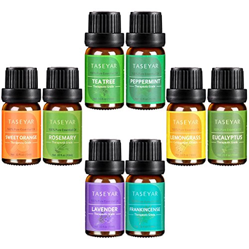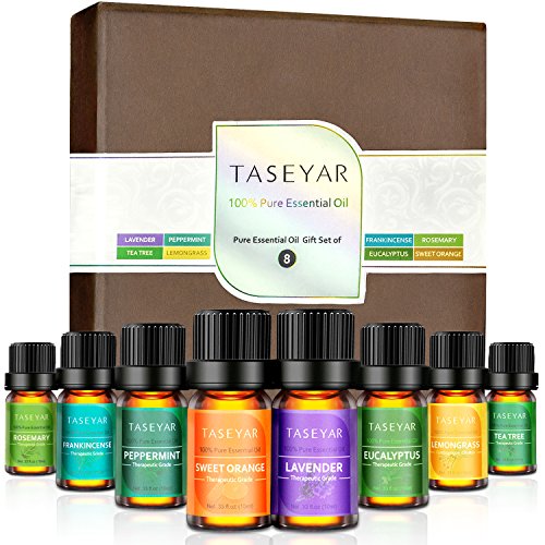 Essential Oils Set of 8,TASEYAR Therapeutic Grade 100% Pure Aromatherapy Scented Oil Gift Set(Frankincense,Lavender,Eucalyptus,Lemongrass,Peppermint,Sweet Orange,Tea Tree,Rosemary),10ml/Each