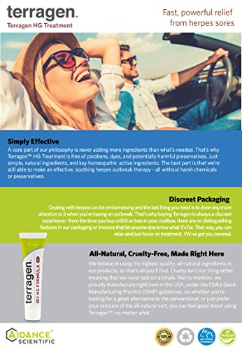 With Patented Activated Minerals® to Speed Results Terragen HG Treatment MAX is the only herpes sore relief ointment of its kind that features patented Activated Minerals®, a proprietary blend including Magnesium Oxide, Silver Oxide, and Zinc Oxide. This technology was developed to facilitate faster, directed delivery of key homeopathic active ingredients to significantly enhance their performance. In addition to their drug delivery properties, each of the ingredients that comprise Activated Minerals® have specific skin care benefits. What Do Customers Like About Terragen? ? Discreet packaging and shopping experience ? Backed by 10 years of research ? FDA-registered remedy ? Free of unnecessary chemicals, artificial scents, parabens and potentially harmful preservatives ? Moisturizing formula will not dry out your skin ? Proudly made in the USA