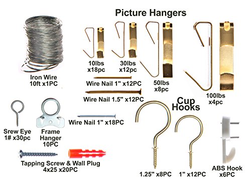 - HARDWARE – the kit includes: anchors, tapping screws, wire nails, cup hooks, ABS hooks, frame hangers, iron wire, picture hangers capable of holding varying weights and screw eyes