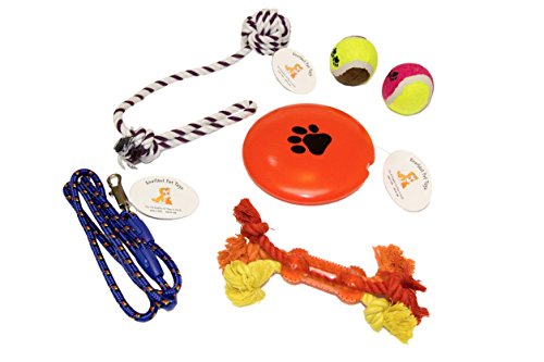 6 PACK BUNDLE INGREDIENTS: (1) 'Paw' Squeaker Disc (2) Tennis Balls (1) Knotted Ball Pull Rope Toy (1) Teether Bone Rope (1) Dog Park Leash