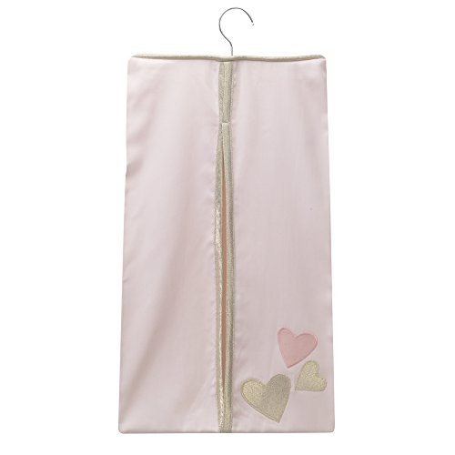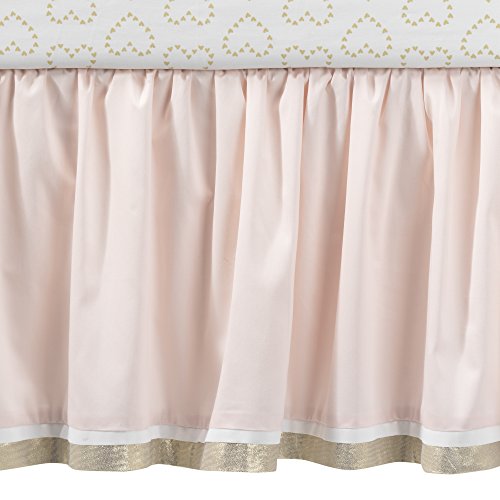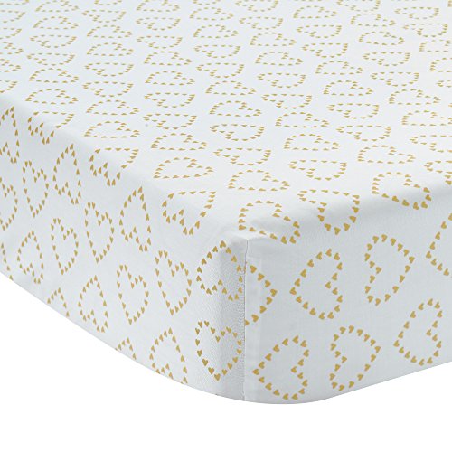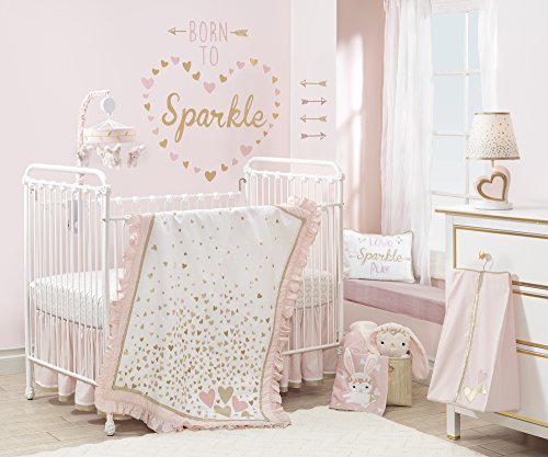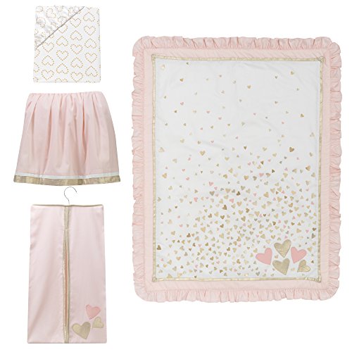 The four piece set includes one quilt, one 100 percent cotton metallic gold heart fitted crib sheet, one shirred dust ruffle (14.5" drop) and one appliqued diaper stacker. Made of a soft cotton blend.