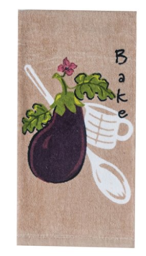 - Plush & soft vibrant taupe towel with eggplant, spoon and measuring cup design