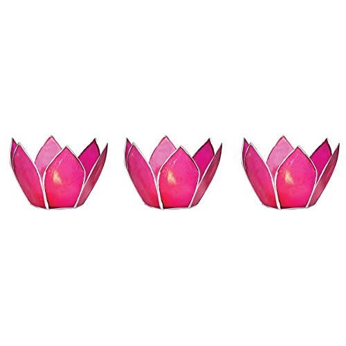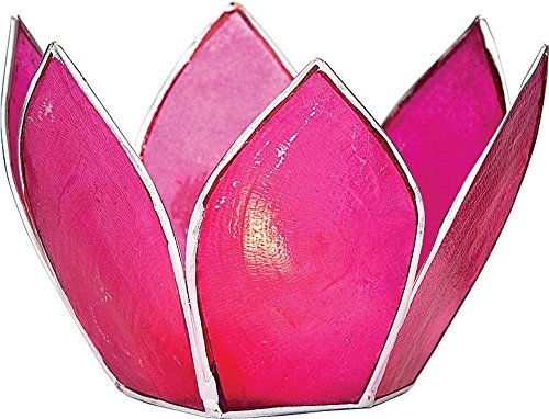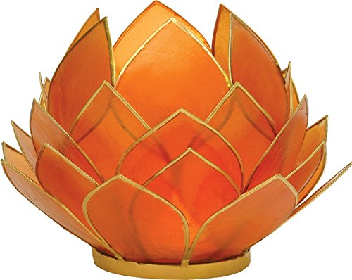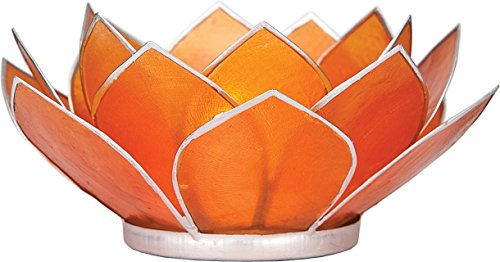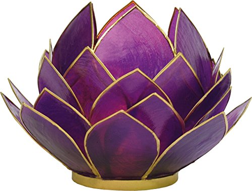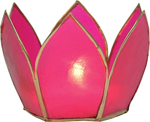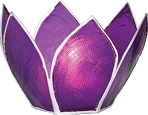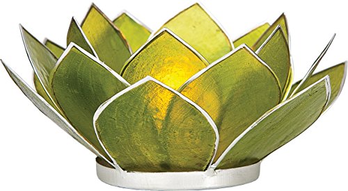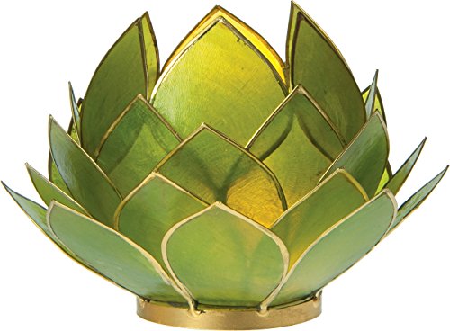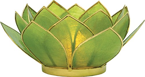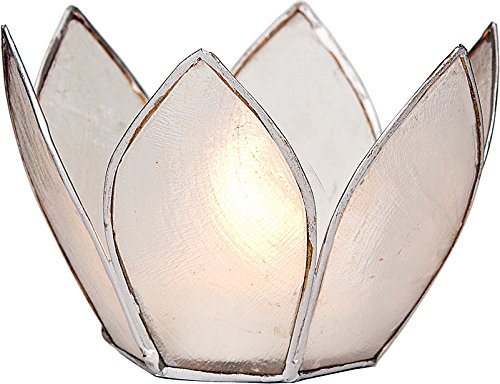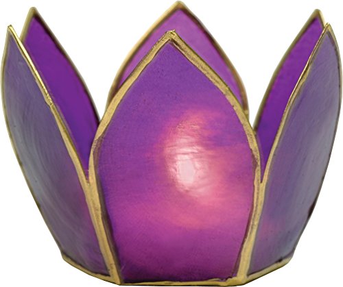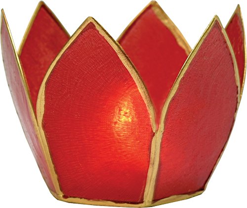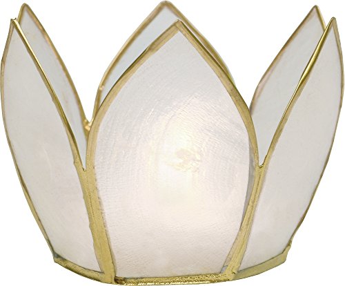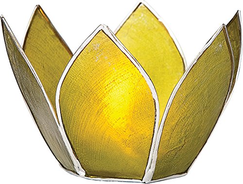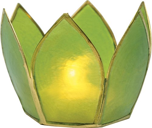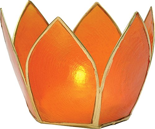 6 inches x 4.5 inches high. Made of natural sea shell of the windowpane oyster, these light and delicate candle holders are hand-crafted in the Philippines. Each piece of shell is hand-cut and wrapped in gold foil for an especially exotic look. Beautifully translucent and opalescent, they provide a soft and shimmery candlelight glow. For use with our flameless tea lights or regular tea lights.Feature