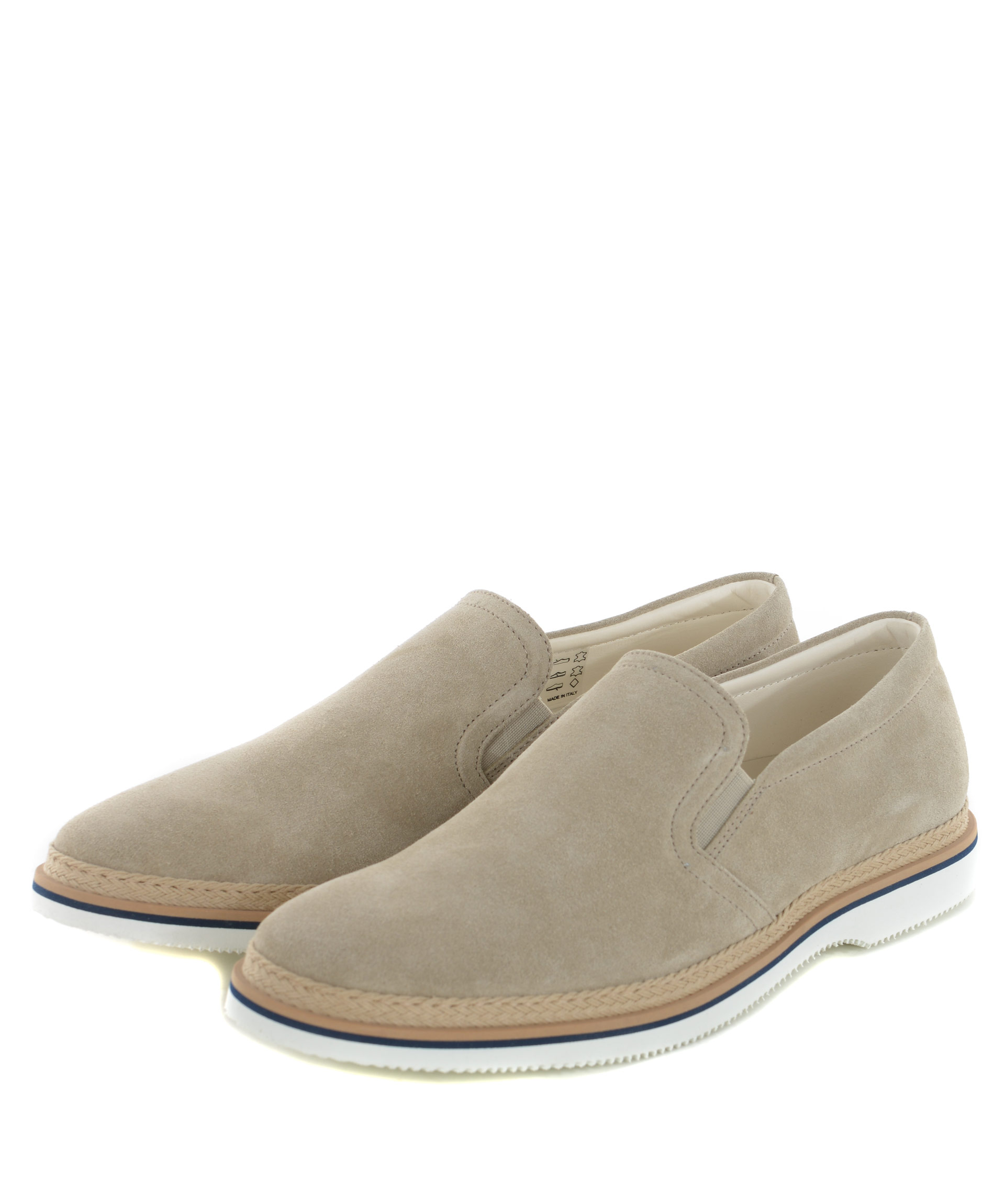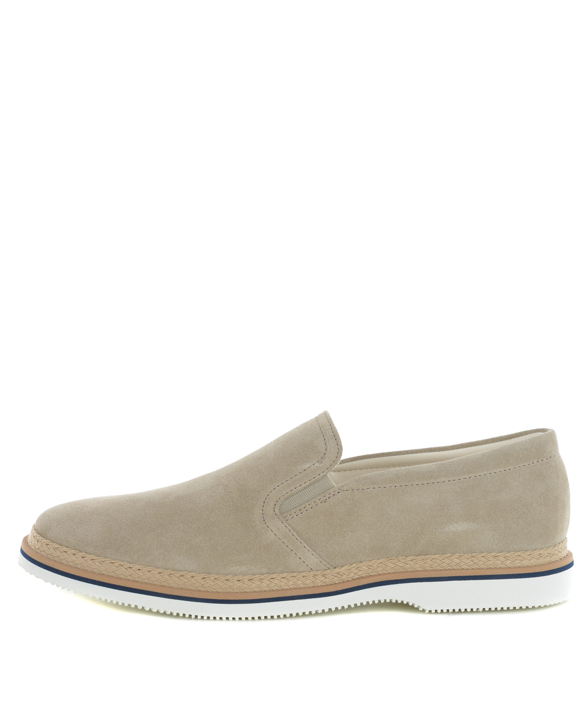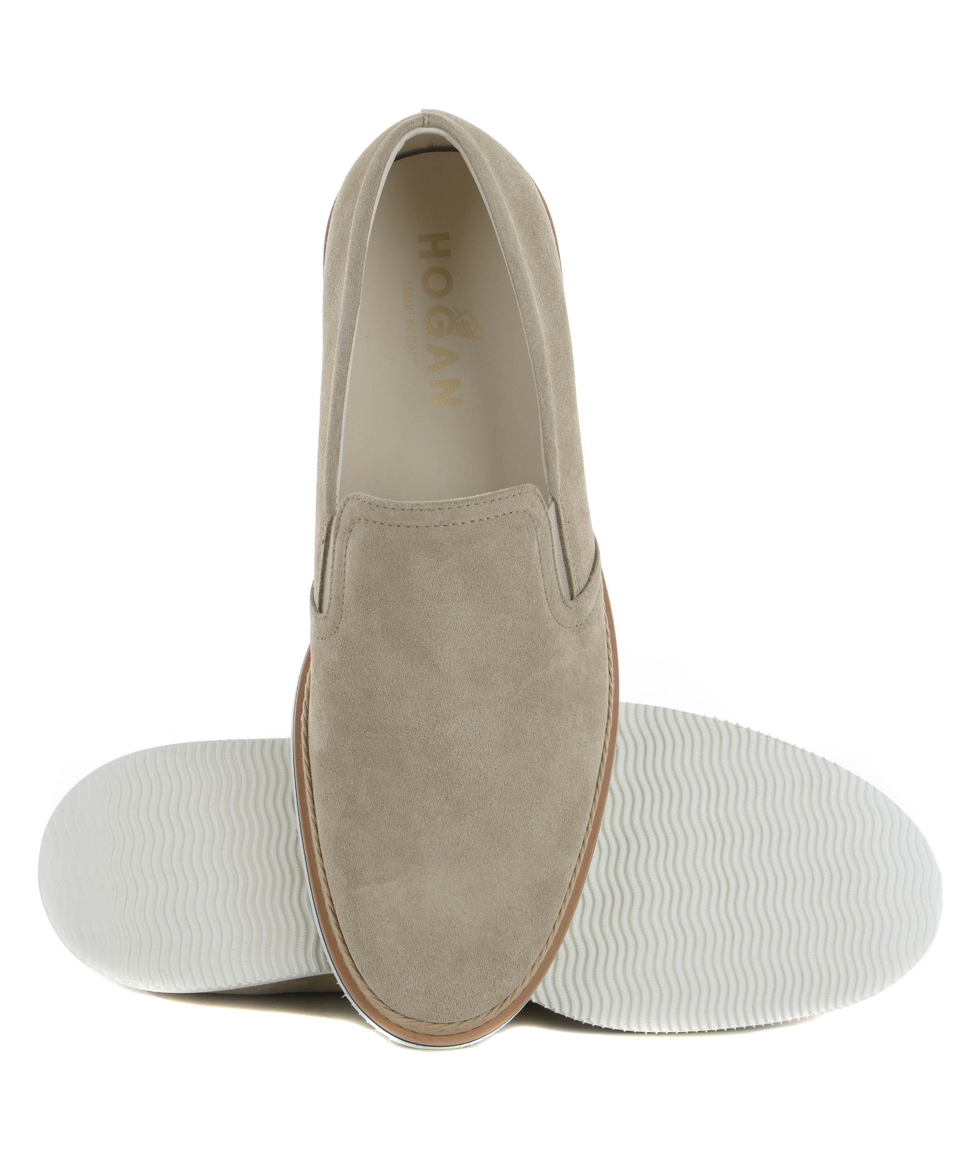 Mocassino uomo Hogan in pelle scamosciata Beige. Inserti elastici laterali. Inserto in corda al fondo. Soletta interna estraibile. Suola 20 mm in gomma bicolore. Misura in foto 6