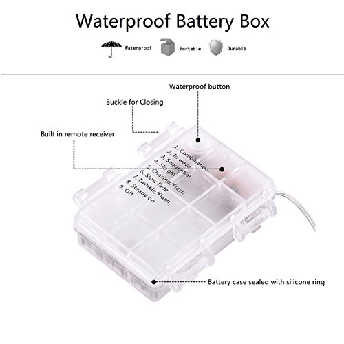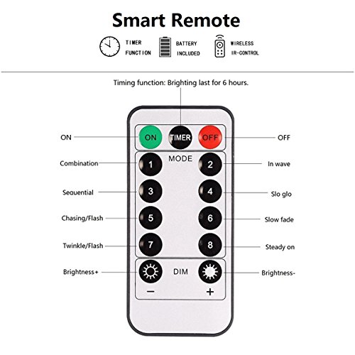 - 3. [2 control types]: it equipped with a ir 13 keys remote control that you can use it to change different lighting effects, setting the time (6 hours on and 18 hours off or you can stop the timing function by press the timer key),adjust the brightness of light. Another way to control the light is to press the button on the battery case