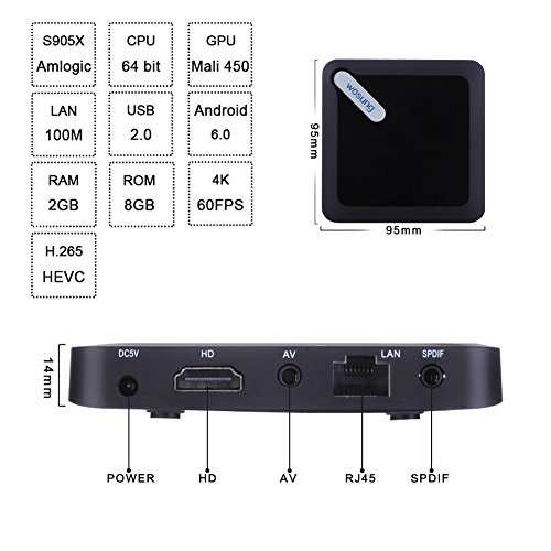 ★Basic features: OS: Android 6.0 Marshmallow CPU: 64 Bits Amlogic S905X Quad-Core Cortex-A53@2.0GHz GPU: Penta-Core Mali-450 with HDMI 2.0 output Card reader: SD/SDHC/MMC cards USB host: 2 High speed USB, Support USB DISK and USB HDD HDMI: HDMI 2.0 Power Supply: DC 5V/2A LAN Ethernet: Up to 100M SDRAM: original 2GB DDR4 Flash: original 8GB EMMC