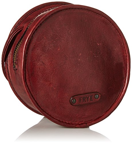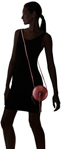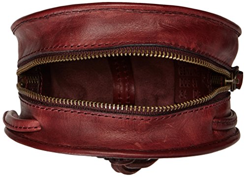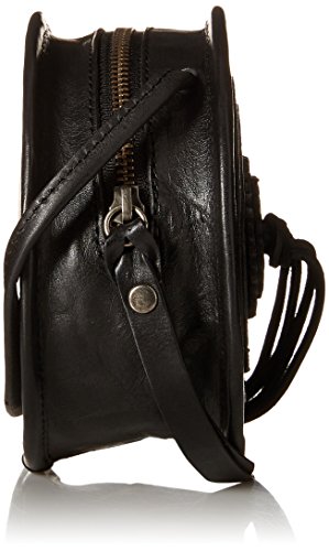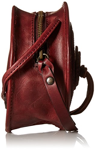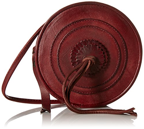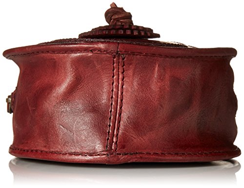 Small round cross-body bag featuring layered overlays with scalloped appliques and fringe at center