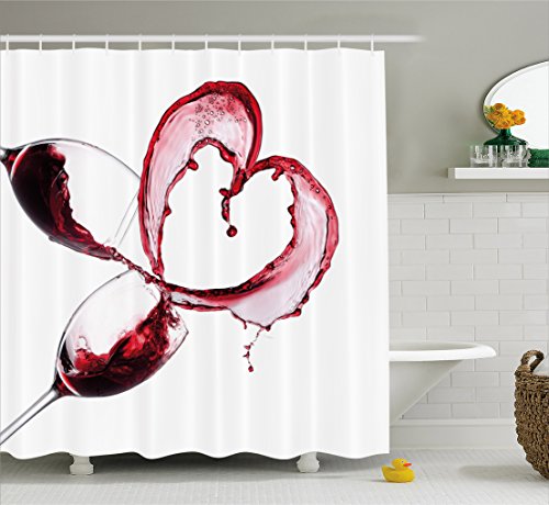 Wine Shower Curtain by Ambesonne, Heart Shape with Spilling Red Wine in Glasses Romantic Valentines Day Concept, Fabric Bathroom Decor Set with Hooks, 84 Inches Extra Long, Burgundy White Pink