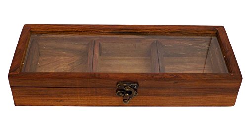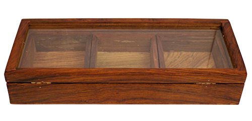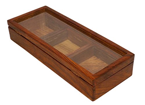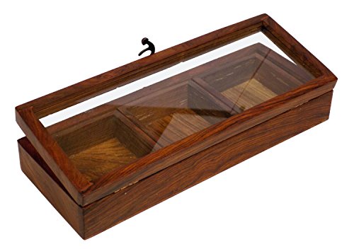-. Feature : Spice Box Material: RoseWood spice box container and glass lid with brass work / Spice Box Size: Length: 11.5 inches, Breadth: 4.5 inches, Height: 2.0-2.25 inches(approx) / Quantity: 1 wooden spice Box with 3 containers and with 1 spoon / Do not expose directly to water. Just wipe out with soft cloth piece. / Spice Box Style: Antique, Decor, Ethnic, Contemporary, Handcrafted, Unique, Casual, Elegant, Lightweight, Eco-friendly, Kitchenware