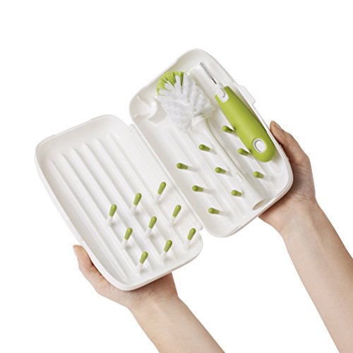 Make cleaning up away from home less of a chore with the OXO tot travel drying rack and bottle brush. This compact cleaning kit is small enough to easily fit into diaper bags or purses while on the road. It opens up into a drying rack with flexible tines to accommodate bottles, nipples, breast pump parts and more. Neatly tucked inside the folded drying rack are a silicone detail cleaner and bottle brush head that assemble to form a full sized bottle brush. The brush has soft and firm bristles for gentle cleaning or serious scrubbing and has a soft handle that is non-slip, even when wet. The silicone detail cleaner cleans tight spots like bottle nipples and breast pump parts more effectively than bristles can. The ventilation holes provide aeration for quick drying, so you can say good-bye to wet brushes in inconvenient plastic bags.Feature