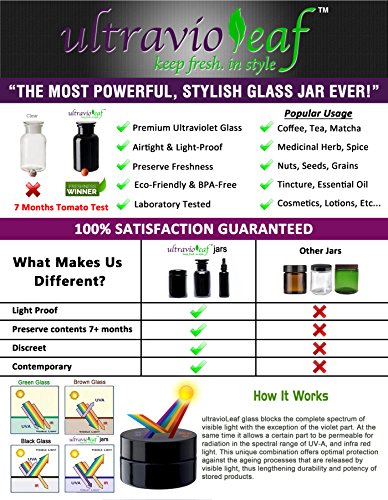 LABORATORY TESTED ULTRAVIOLET GLASS PROTECTS AGAINST HARMFUL LIGHT - Premium European UltraViolet Glass (UV-A) Storage Containers for storing your nuts, seeds, herbs, coffee, teas, super foods, dried foods, granola, algae, and protein powders, baking flours. It prevents harmful visible light rays from penetrating and degrading your stored products, while at the same time allowing beneficial UV and infrared wavelengths of light that can kill molds, algae, and bacteria.
