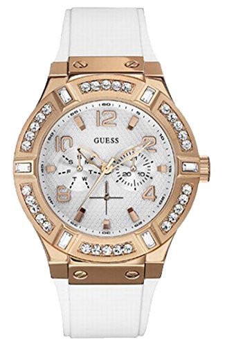- Brand: Guess Watch - Gender: Female - Strap on rubber, white color - steel Case in pink - Dial color black - Machinery: Quartz - Functions: calendar - water Resistant: 50 mtrs - box Dimensions: 44 mlm - Garantíto 2&years