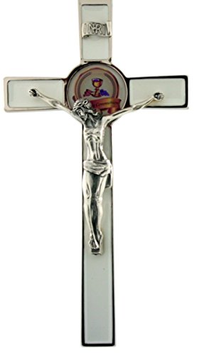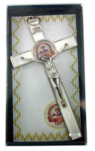 First Communion Silver Tone and White Enamel Wall Cross Crucifix, 8 Inch