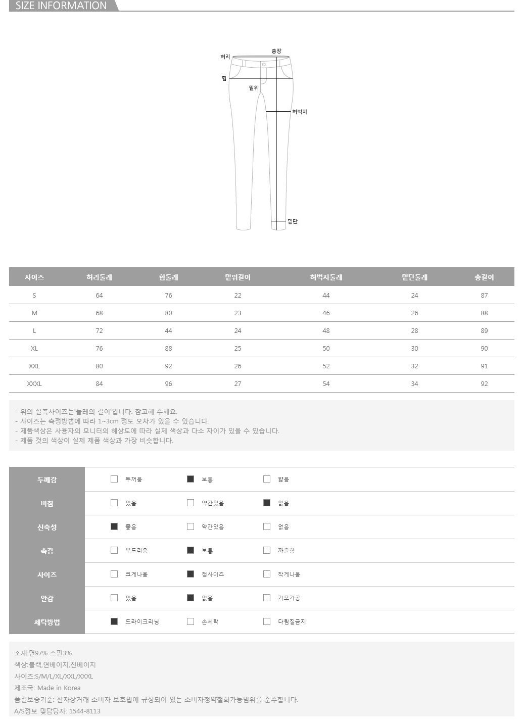 탄탄한 조직감의 코튼과 쫀득 쫀득 탁월한 신축성을 자랑하는 스판이 가미되어 허리부터 발목까지 한 치의 군살 없이 잡아드림은 물론 허리 안쪽에서 탄탄하게 잡아주는 쫀쫀한 시크릿 밴딩으로 24시간 편안함을 유지해주어 누가 입어도 만족스럽게 즐길 수 있다는 사실! 또한 군데군데 약간의 데미지 디테일과 밑단 수술 라인으로 기존의 코튼 팬츠에서는 보기 힘든 빈티지한 감각마저 UP UP~ S-XXXL까지 폭 넓은 사이즈로 구성되어 있으니 체형에 구애 없이 만나보세요:)