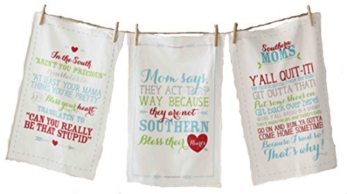 Flour sack towels feature printed border detail and humorous sentiments to make any "Southern Mom" proud.