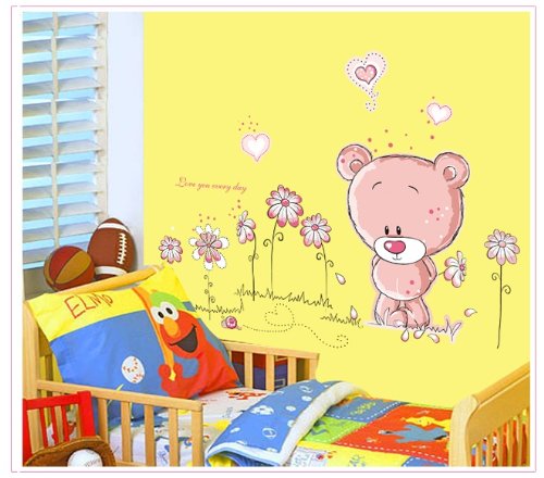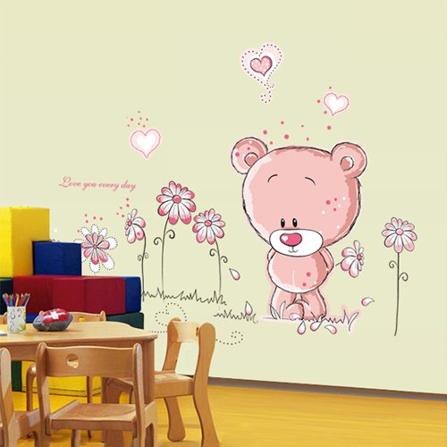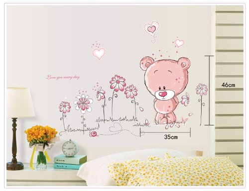 -. Title : Kappier Adorable Pink Teddy Bear with Flowers and Hearts - Love You Everyday Peel & Stick Removable Wall Decals