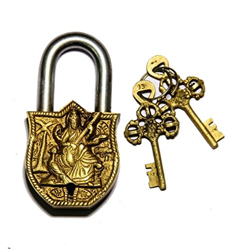 Purpledip Handmade Brass Vinatge Padlock: Saraswati, Hindu Goddess Of Knowledge, Music, Arts (10008)