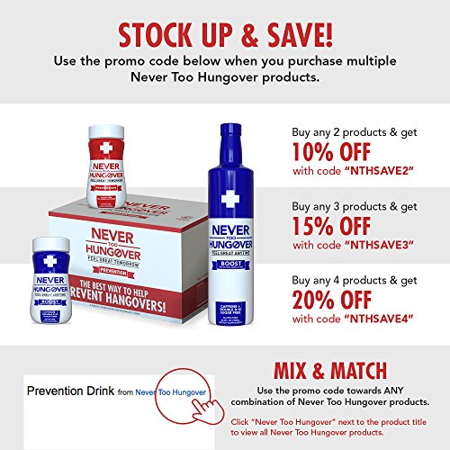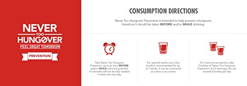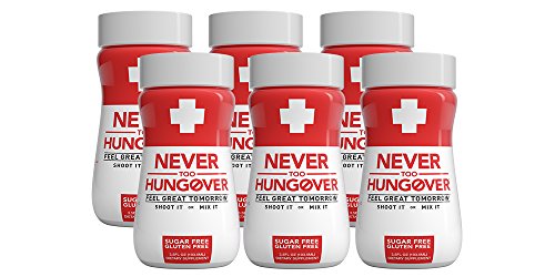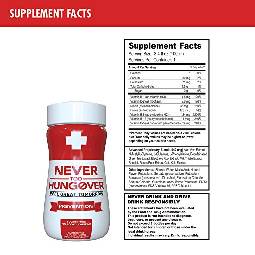 -. Binding : Health and Beauty -. Brand : Never Too Hungover -. EAN : 0728028354294 -. Feature : Comprised of a natural vitamin blend, antioxidants, amino acids, nutrients, and minerals. Key ingredients include Vitamin B, Potassium, Aloe Vera, Green Tea Extract, Gotu Kola Extract and Milk Thistle. / NEVER TOO HUNGOVER works by neutralizing and processing toxins created by alcohol in the liver and kidneys. / Sugar Free, Gluten Free & No Added Caffeine / Delicious sweet citrus flavor / Shoot it or Mix it -. IsAdultProduct : 0 -. Label : Never Too Hungover -. Manufacturer : Never Too Hungover -. PackageQuantity : 6 -. ProductGroup : Health and Beauty -. ProductTypeName : HEALTH_PERSONAL_CARE -. Publisher : Never Too Hungover -. Size : 3.5 Oz -. Studio : Never Too Hungover -. Title : Never Too Hungover - Hangover Prevention Drink (6 Pack - 3.5 Oz Bottles) -. UPC : 728028354294