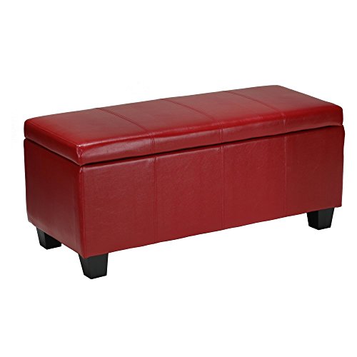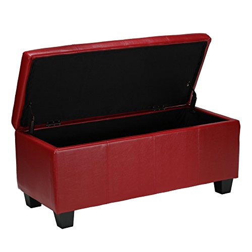 -. Brand : Cortesi Home -. Feature : Dimensions: 39.5W x 17D x 17H in. / Storage dimensions: 36.5W x 14D x 10H in. / Bright red vinyl / Solid wood frame on black plastic legs / Safety hinges on lid prevent sudden closure -. Label : Cortesi Home -. Manufacturer : Cortesi Home -. MPN : CH-OT161555 -. PackageQuantity : 1 -. PartNumber : CH-OT161555 -. ProductGroup : Furniture -. ProductTypeName : HOME_FURNITURE_AND_DECOR -. Publisher : Cortesi Home -. Studio : Cortesi Home -. Title : Cortesi Home Alba Storage Ottoman