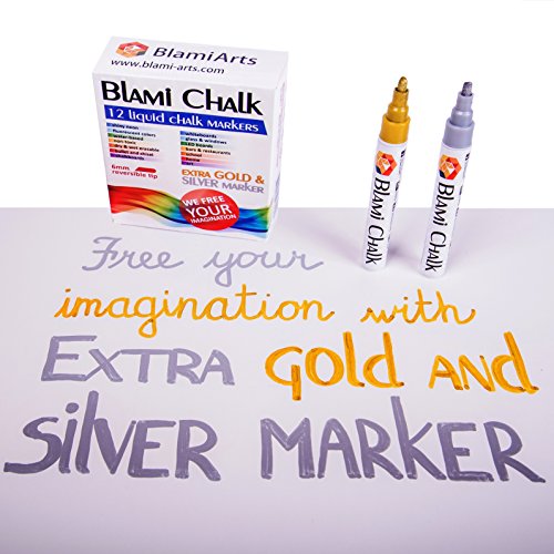 Blami Arts presents Extended set of Chalk & Glass markers for Kids and Adults. Our liquid chalk pens decorate and add bright and vivid colors to all kinds of objects. Set of 12 shiny chalk markers with bold and fine tip. Chalk pens are filled with high quality dry & wet erasable chalk paint! Free your imagination with our premium high quality chalk markers now! Dare to be unique with bonus GOLD and SILVER color included in your glass marker set. 12 markers for the price of 10!