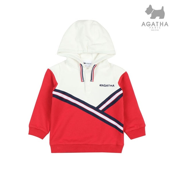 따뜻한 기모 져지 소재의 후드 티셔츠로 배색 절개와 테이프 장식이 포인트인 아이템입니다.