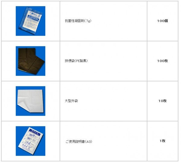 | セット内容 | 抗菌性凝固剤7g×100個、排便袋(黒)×100枚、大型外袋×10枚、ご使用説明書(A3ポスター)×1枚 |