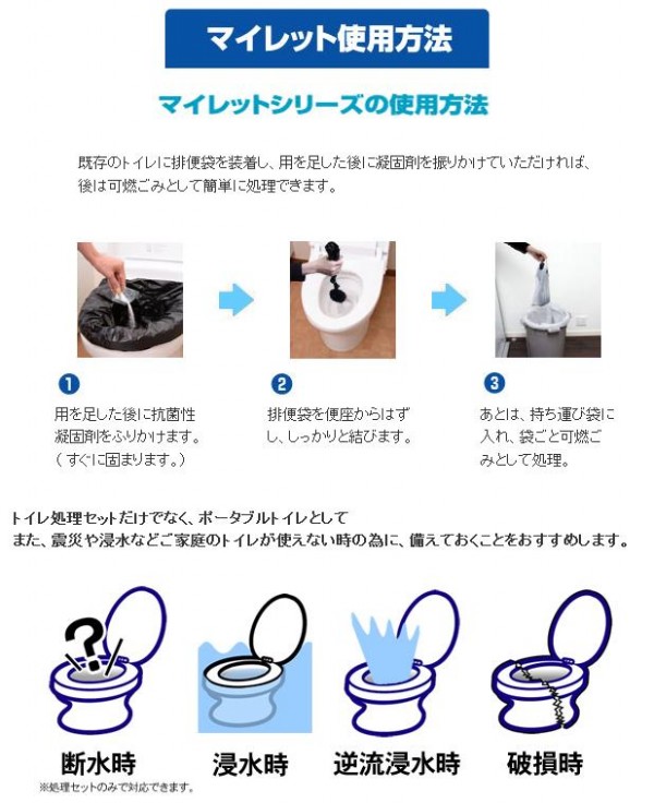 | 水を必要としないのでいつでもどこでも排泄でき、排泄物をすばやく固めて雑菌・悪臭を抑えるので衛生的です。100回分入りでお得になっています。コンパクトで収納場所を選ばず、約10年間の長期保存が可能ですので、ご家庭などの自主防災に役立ちます。 |