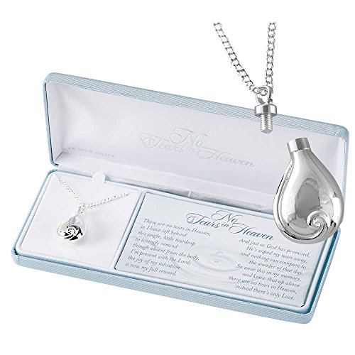 -. Binding : Jewelry -. Brand : Dicksons -. Color : Silver -. Department : womens -. EAN : 0603799209168 -. Feature : Made of silver plated metal; Easy on sensitive skin / Rolo style chain is 24 inches with a 2 inch extension / Tiny urn is 1 inch; Screw off the top to get to the holding cavity / Includes colorful card with artwork and inspirational message / Packaged in a beautiful, cushioned, deluxe presentation box -. Label : Dicksons -. Manufacturer : Dicksons -. Model : 73-4101P -. MPN : 73-4101P -. PackageQuantity : 1 -. PartNumber : 73-4101P -. ProductGroup : Jewelry -. ProductTypeName : FASHIONNECKLACEBRACELETANKLET -. Publisher : Dicksons -. Studio : Dicksons -. Title : No Tears in Heaven Memorial Urn Charm Silver Plated 24 inch Pendant Necklace -. UPC : 603799209168