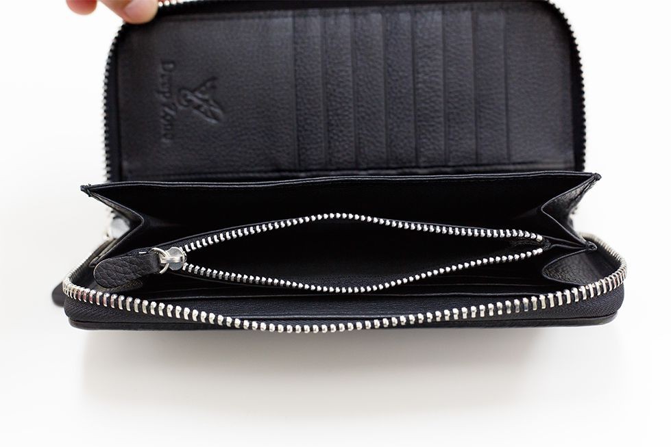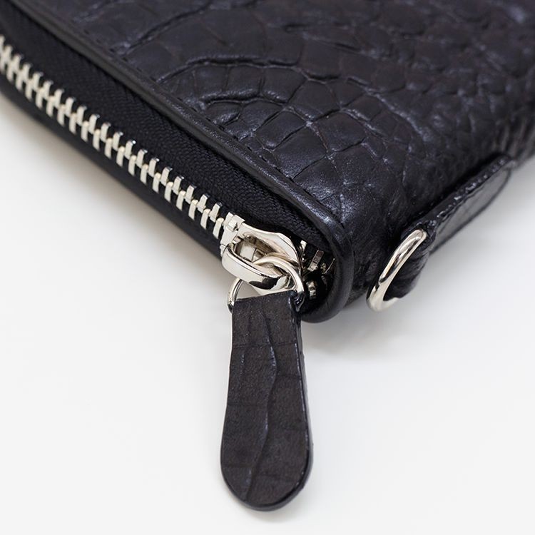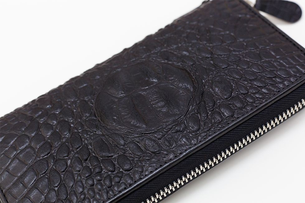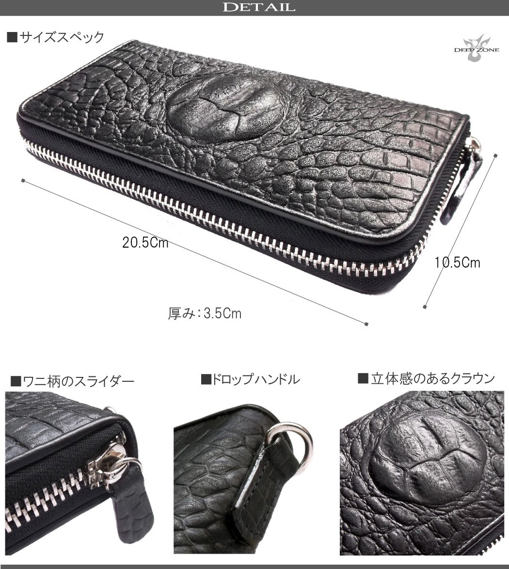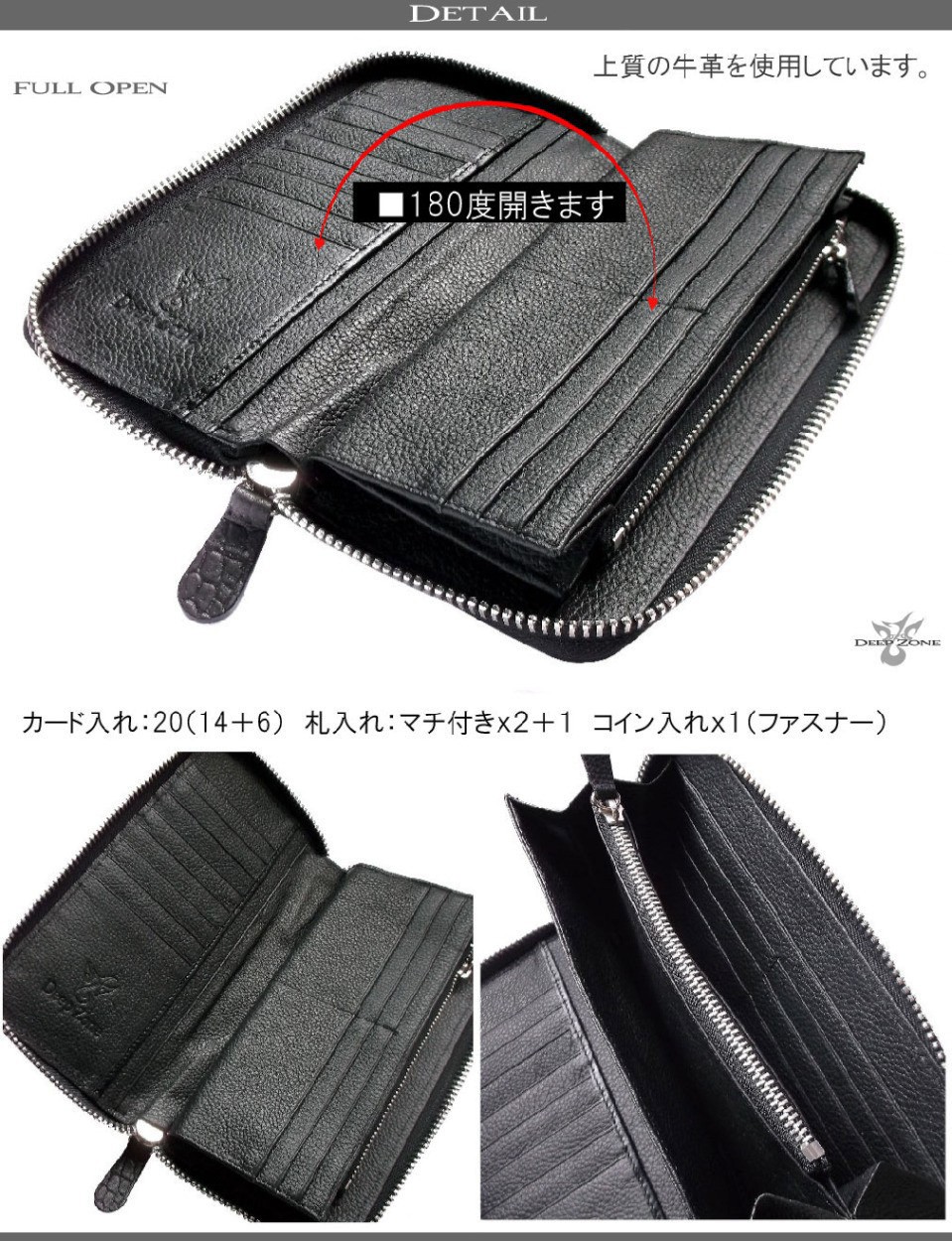 上質の牛革を本物のワニの背側と見違えるほど精巧に型押しされています。財布本体180度にフルオープンでき機能性に優れています。インナーにも、上質の牛革を使用しております。細部に至るまで 丹念かつ丁寧に縫製及び仕上げが施された拘りの逸品です。【サイズ】縦10.5cm × 横20.5cm × 厚さ3.5cm【素材】牛革(クロコダイル型押し)【カラー】ブラック(1色)【仕様】カード入れ × 20札入れ × 3小銭入れ × 1(ファスナー式)【特徴】保護袋付き