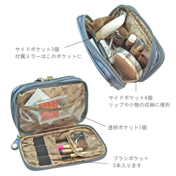 fk094igrjsポケットがたくさん付いて、整理整頓もラクラク大きく開くので化粧品の出し入れもしやすいです サイズ 幅18×奥行き5×高さ10cm 個装サイズ:18×5×10cm 重量 150g 個装重量:190g 仕様 開閉/片側:ダブルファスナー、片側:ファスナー ブラシポケット:5本分 サイドポケット:7個 透明ポケット:1個 付属品 ポケットミラー 生産国 中国 収納力バツグンの化粧ポーチ ポケットがたくさん付いて、整理整頓もラクラク大きく開くので化粧品の出し入れもしやすいです