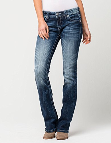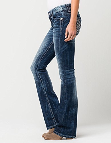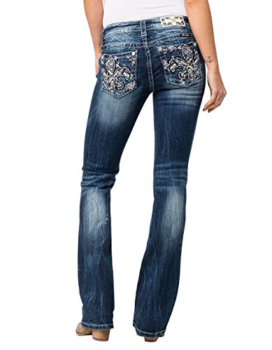 Miss Me Women's Flirty Fleur De Lis Mid- Rise Boot Cut Jeans,Dark Blue,30