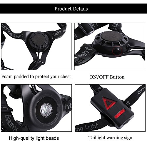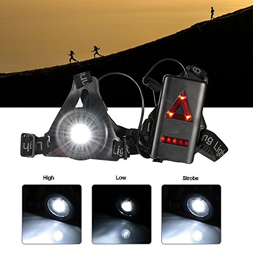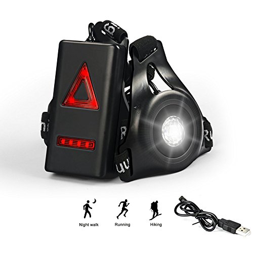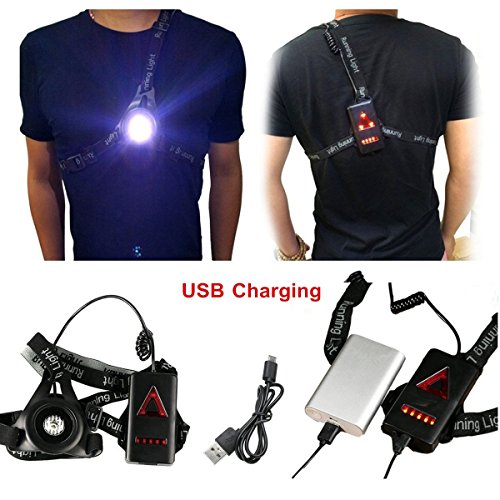 The Chest Running Light is a lightweight, chest mounted running light. Best Chest Running Light - Stay Visible, Be Seen Be Safe The running lights illuminate your path within 20 meters area with a brilliant 90-250 lumens, 3 light modes when you run or walk in a dark, and has an inbuilt rechargeable battery, chargeable by micro USB lead supplied.