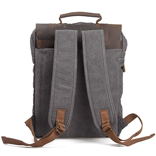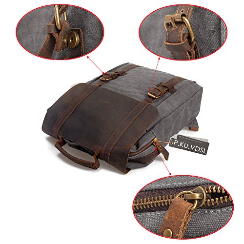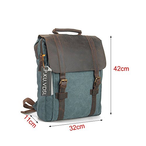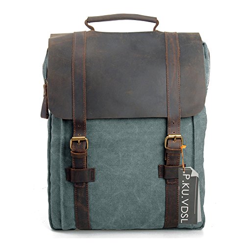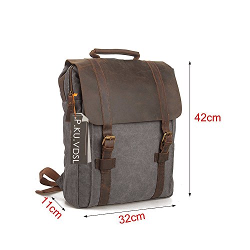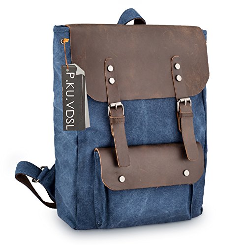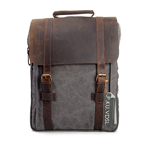 -. Feature : ★ STYLISH DESIGN --P.KU.VDSL Canvas Laptop Backpack, This backpack has an open exterior pocket concealed by a leather flap as well as two interior pockets. It also has a padded compartment inside for your laptop. Large interior pocket is secured with both a heavy duty zipper and a sturdy leather flap held down by a strong magnetic snap closure. / ★ PRACTICAL -- Casual Daypacks, Retro Rucksack, This backpack is ideal for school, work, traveling and hiking, Mountaineering, Camping. Moreover, it also perfect for men and women. Has quality construction and a stylish design, this fashionable bag will bring compliments and envy, as it is both practical and chic. / ★ LARGE CAPACITY -- 31cm(L)x42cm(H)x11cm(W)/12.2"(L)x16.5"(H)x4.3"(W) SIZE, it's very easy to carry with ample interior room to accommodate a 15" laptop, A4 paper, notebooks, and a variety of other items without weighing down the wear. / ★ EXQUISITE CRAFT -- A Vintage Canvas Backpack, The workmanship is evident throughout with smooth and even stitching and extremely durable full grain high quality leather. The rest of the bag, including the straps, is made of canvas so it will be comfortable when carrying it on your shoulders. / ★ GUARANTEED --We are so confident in the quality of our product that we offer a 45-day satisfaction guarantee! If you are unsatisfied, simply contact us to return the product for a full refund. (NOTE: Product Image 100% In-Kind Shooting, It Is Normal That The Color cause a Little Different Due To Production Batch or Ambient Light And Different Display Resolutions).