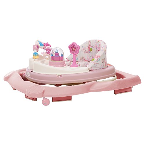 -. Feature : Machine-washable padded seat ,Oversized snack/play tray. / Two swing-open activity trays , Disney walker seat easily adjusts to three heights. / Sturdy wheels for use on carpet, tile or wood floors, Grip strips reduce movement on uneven surfaces. / Folds down easily for storage and travel. / Child must be able to sit up unassisted before using this product.