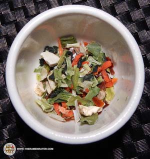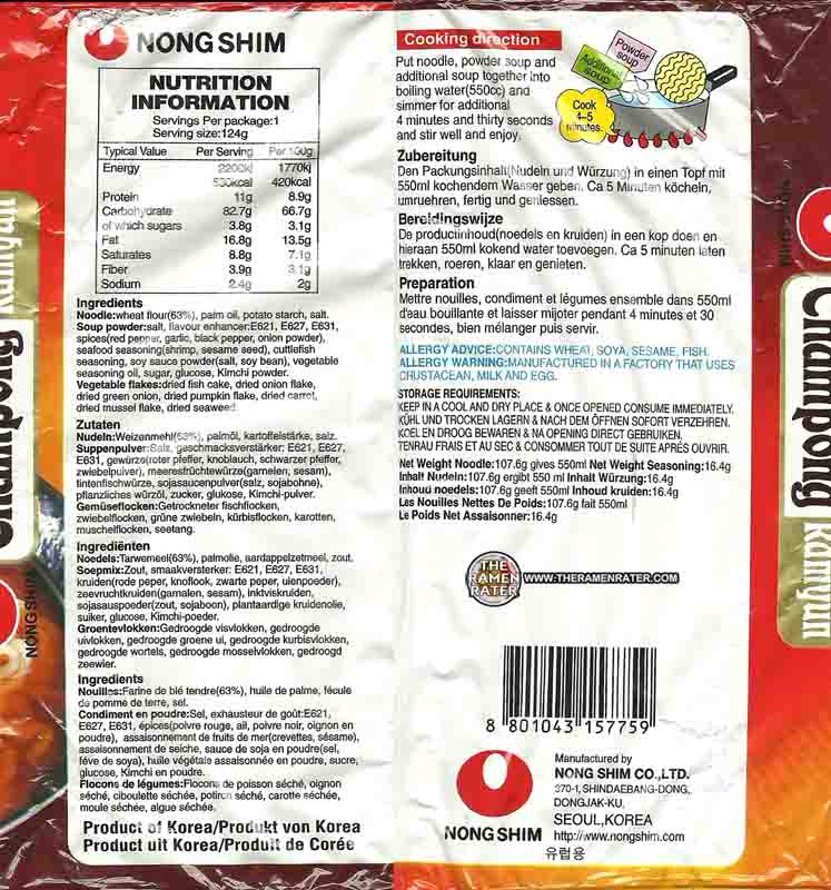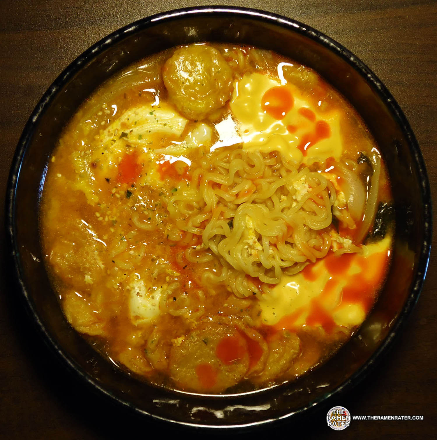 Finished (click image to enlarge). Added some onion・ odeng・ an egg・ some processed cheese・ some splashes of Tabasco Buffalo Style hot sauce and a little bit of Ajishima Kimchi Furikake. The noodles are nice and wide ? they sucked up the broth very nicely and are slightly chewier than the last few Nongshim varieties I¨ve had. The broth is great ? very very spicy and has a kind of seafood tomato soup kind of sense to it. Very good! The veggies / fish components aren¨t bad ? all in all a great pack of noodles! 4.0 out of 5.0 stars!?