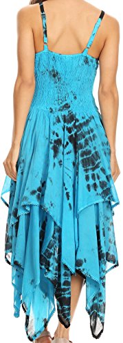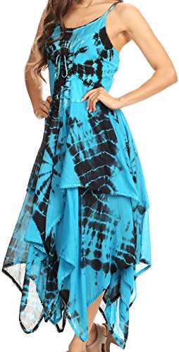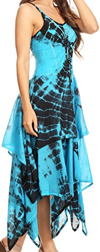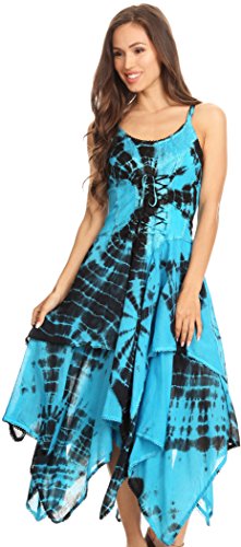 Sakkas' batik dresses feature rich tie dye colors, lace up corset style bodice and a full double layer handkerchief hem skirt. Enjoy wearing a flattering feminine dress without sacrificing comfort!