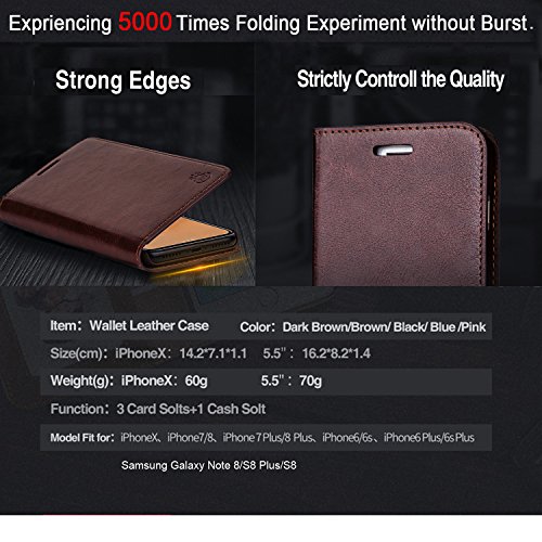 PRODUCT DETAILS ITEM Wallet Leather Case COLOR Brown, Black, Blue, , Rose Red SIZE(CM) iphone 4.7": 14.2*7.1*1.1 iphone 5.5": 16.2*8.2*1.4 FUNTION 3 Card slots 1 Cash slot,Ultra-strong magnetic closure, Stand view design FIT FOR iPhone X,iPhone 6/6S, iPhone 6 Plus/6S Plus, iPhone 7,iPhone 7 Plus,iPhone 5/5S/SE,Samsung Galaxy S8 Plus,Samsung Galaxy S8,Samsung Galaxy Note8,Samsung Galaxy S7,Samsung Galaxy S7 Edge