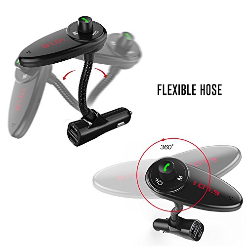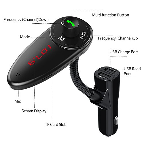 2 USB Ports - This fm transmitter has 2 USB ports: the lower one is designed for charging ((5V/2.4A high speed output) and the upper one is for reading USB files. This feature enables you to play music and charge your phone or other devices simultaneously;
