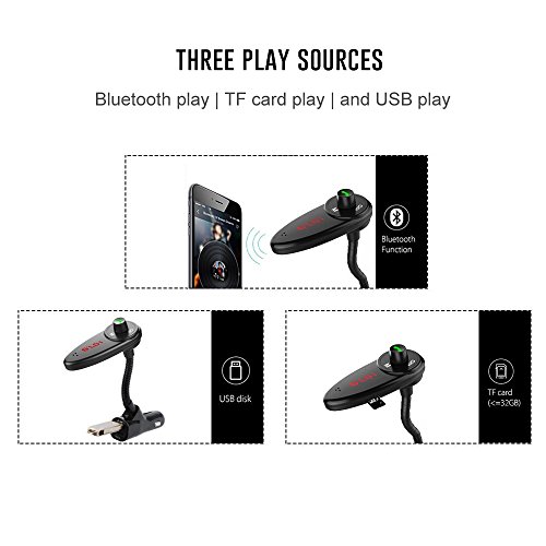 Three Playing Sources and Three Playing Modes - This fm transmitter supports 3 playing sources: Bluetooth, TF card and USB flash drive. Short press “Mode” button to switch the playing source. When you’re playing music through TF card or USB flash drive, long press “Mode” button to switch between the 3 playing modes: repeat, normal and shuffle;